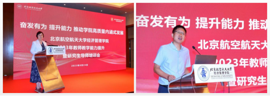 本次培训会特别邀请了七位校内外专家进行专题报告和讲座。北京师范大学的赵春明教授分享了高校教师如何成为好老师和大先生的心得体会,探讨了师德与师能的辩证关系,强调教师不仅要传授知识,还要成为品格教育的引领者。中央财经大学金融公司副经理苟琴则着重解读了如何提升课程建设,强调课程质量的科学性、规范性和系统性。北航仪器科学与光电工程公司教授、北航教务部部长钱政教授分享了二十年的教育经验,强调专业建设的重要性和教学改革的必要性,并提倡青年教师勇于担当。物理公司经理吕广宏则从教学成果奖申报的角度出发,鼓励教师科研化教学,注重成果积累。北航出版社理工图书分社社长蔡喆为参会教师详细解读了国家教材管理政策和新型云教材的应用。北航研究生院副处长郑磊分析了研究生学位论文质量提升的形势和意义,强调严格管理和落实质量控制措施。经管公司王理教授重点讲述了国家重点专项申请经验,并阐释了其在推动科技创新方面的作用。