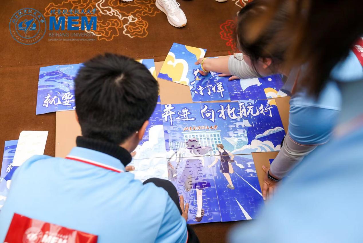 拼图环节采用分组模式,每组负责3块小拼图,最后再将各组拼图放在一起展示出“梦想不打烊,就要勇敢追,携手并进,向北航行”主题海报,反映出同学们共同心声。一个个活动让大家感受到友爱互助、团结一心,协作前行的魅力,在展现自我的同时也提升了团队凝聚力,增进了同学们的感情,加深了同学们作为北航一分子的自豪感和荣誉感!