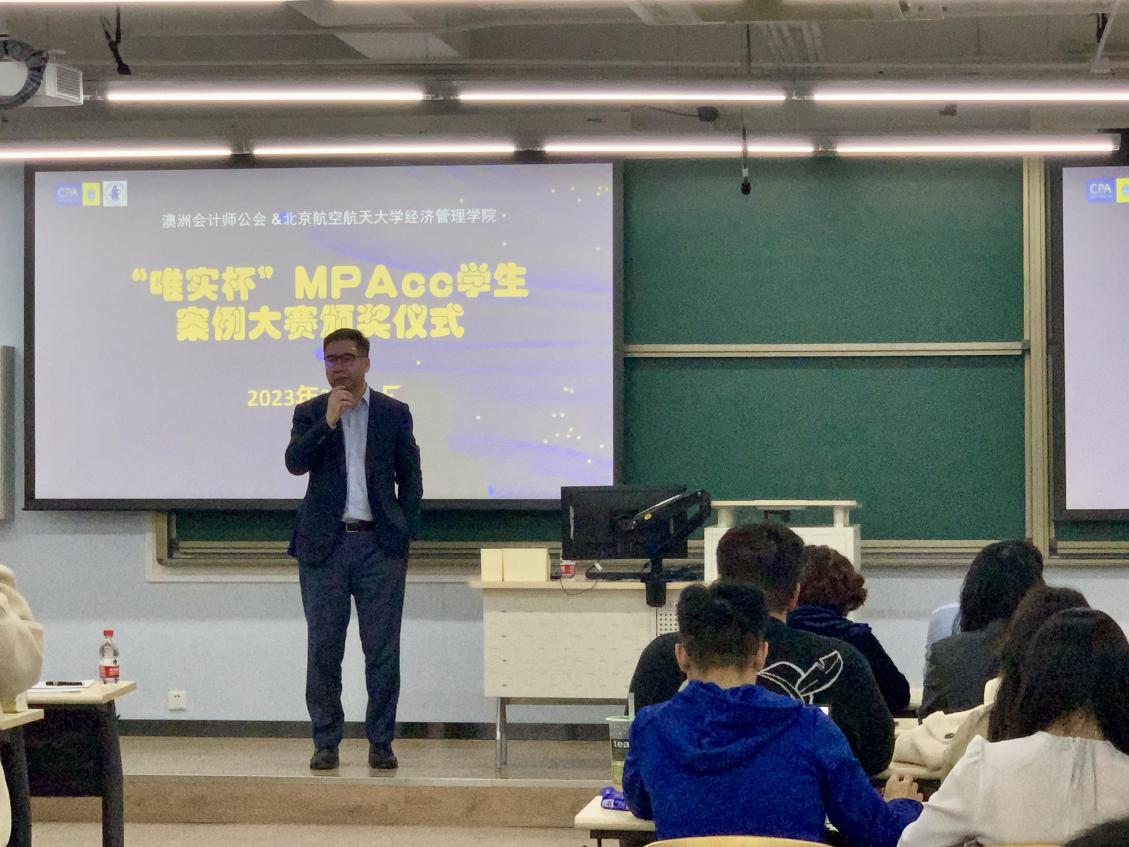 “向阳草木青,明媚春光暖,春天的美,俯拾皆是。”3月11日晚,北航经管公司“唯实杯”MPAcc员工案例大赛颁奖仪式在公司路教学区5号楼112教室隆重举行。2021级、2022级MPAcc研究生共百余人参加活动,澳洲会计师公会北京代表处首席代表孟文静女士、华北区委员会会长彭飞先生、财政部中国注册会计师协会国际及港澳台事务部主任宋祉健先生、中国铁建财务有限公司副总经理薛志辉先生、北京奔驰汽车有限公司战略与内部控制高级经理左晓帆女士、利来国际副经理牟晖副教授、周宁教授、MPAcc教育中心副主任任晖老师出席颁奖仪式。仪式由利来国际MPAcc教育中心主任白明副教授主持。