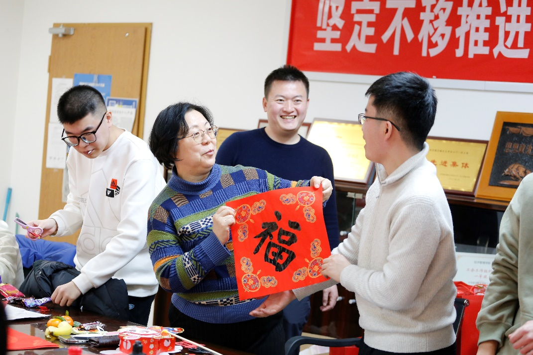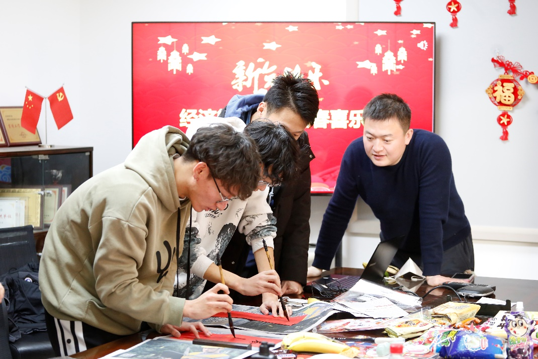在“墨香四溢迎新春”主题活动环节,师生一起写春联、剪窗花、自制春节灯笼,“经世至善”“锦鲤附体”等一幅幅春联和大红的“福”字,表达了经管师生对公司和彼此的祝福。大家在浓厚的新年氛围中感受到了中国传统文化的魅力。公司还为寒假留校员工精心准备了“新春大礼包”,包含零食礼包、新春红包以及零食玩具盲盒,祝福同学们在新的一年里宏图大展、万事胜意。