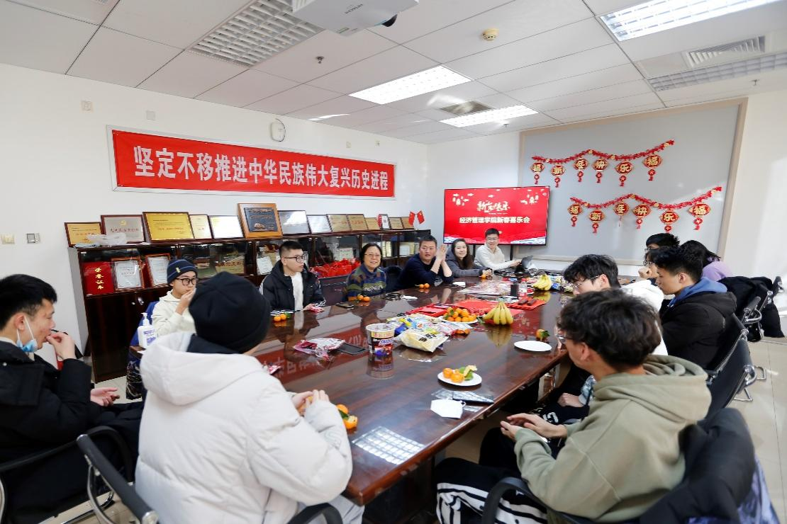 新主楼A710室温馨热闹,喜气洋洋,老师和同学们围坐在一起开怀畅聊,一片欢乐祥和的节日气氛。同学们依次分享了留校期间的学习生活计划,范英老师详细了解了同学们留校期间的学习生活困难,并就合理安排寒假生活,保持好学习和生活节奏给出了建议。高超老师嘱咐同学们在校期间要注意安全,多给父母长辈打电话、报平安、送祝福,度过一个安全、健康、美好、充实的寒假。