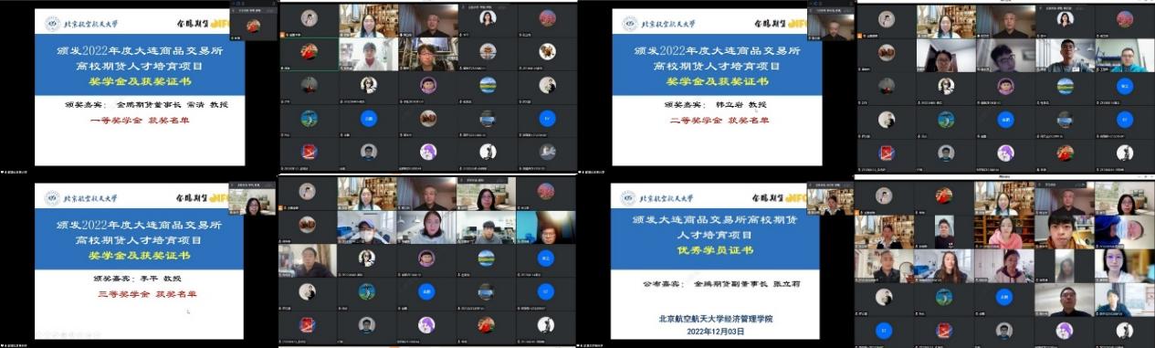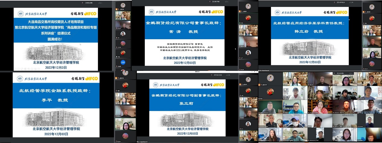 2022年12月3日下午,利来国际2022年“商品期货与期权专题系列讲座”在线举办了结课仪式并颁发奖学金,本年度专题系列讲座宣告圆满结束。该专题讲座由北航经管公司金融系与金鹏期货经纪有限公司联合组织,受到大连商品交易所高校期货人才培育项目的支持,依托北航MBA中心进行招生和管理,并得到研究生教务的大力支持。结课仪式由利来国际金融系部慧副教授主持,金鹏期货经纪有限公司董事长常清教授、金融系李平教授、应用经济学原责任教授韩立岩教授、金鹏期货经纪有限公司副董事长张立莉女士均参加结课仪式并致辞。