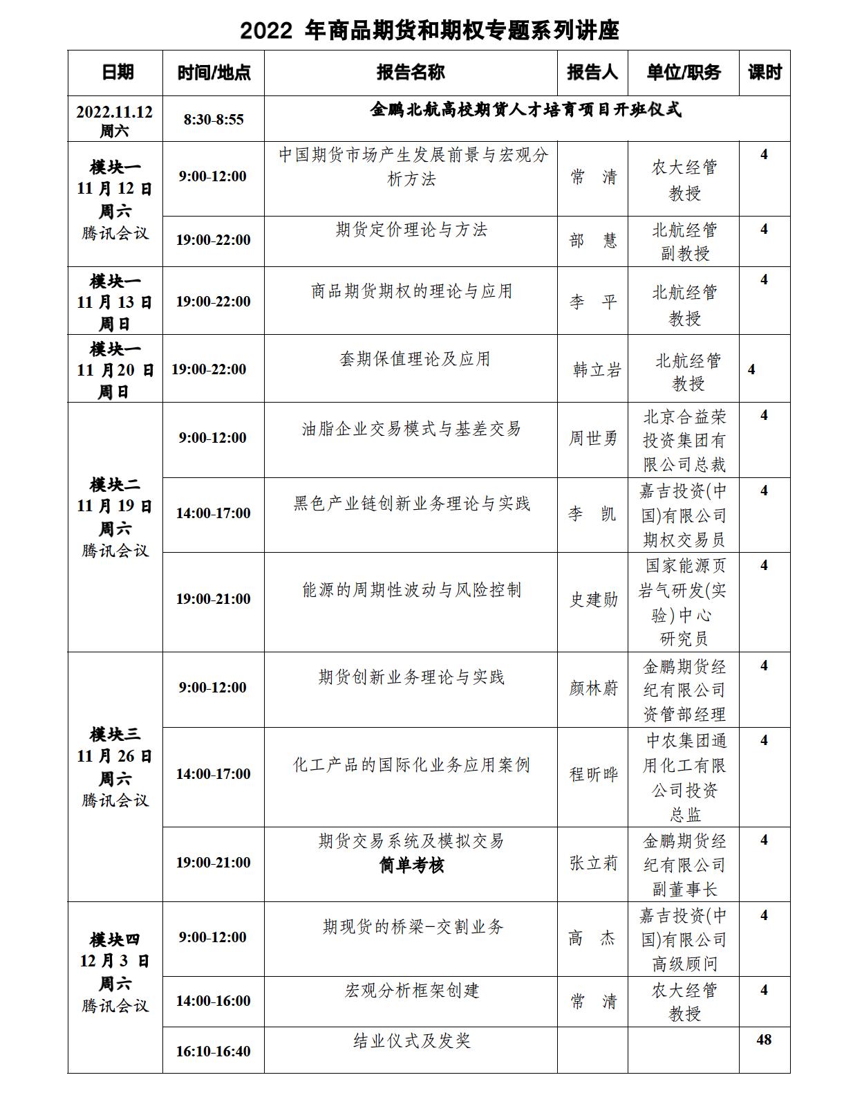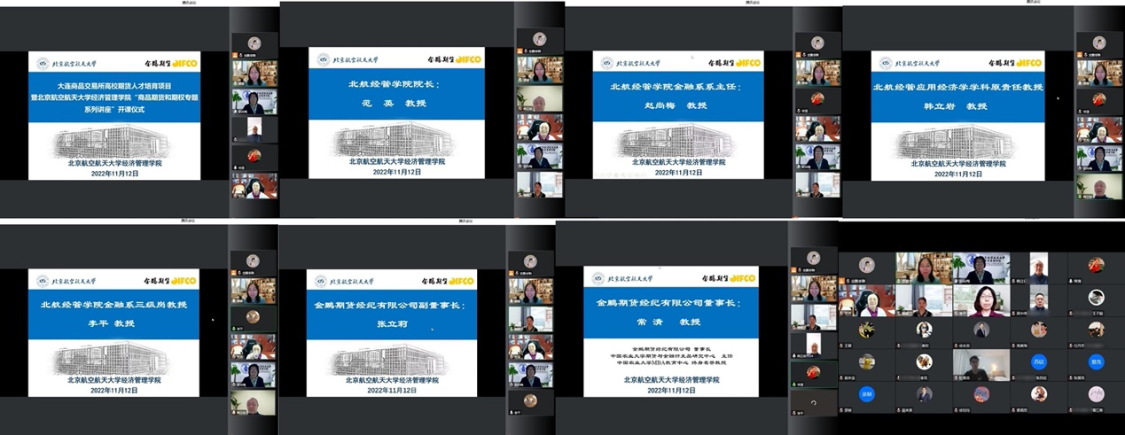 2022年11月12日上午,北航经管公司2022年“商品期货与期权专题系列讲座”正式启动,并在线上举办开班仪式。“商品期货与期权专题系列讲座”是北航经管公司金融系打造的实践前沿讲座系列之一。该专题系列讲座由北航经管公司金融系与金鹏期货经纪有限公司联合组织,受到大连商品交易所高校人才培育项目的支持,依托北航MBA中心进行招生和管理。