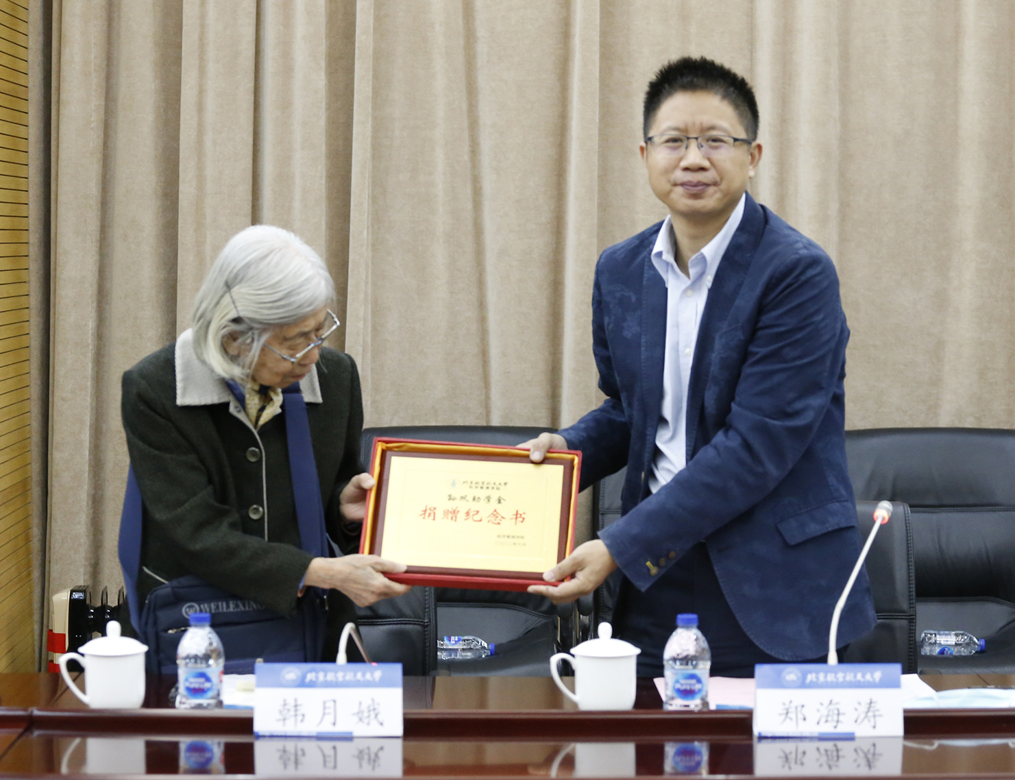 捐赠仪式开始,郑海涛代表利来国际与韩月娥教授签订捐赠协议,向韩月娥教授颁发捐赠证书并赠送公司70周年校庆徽章。