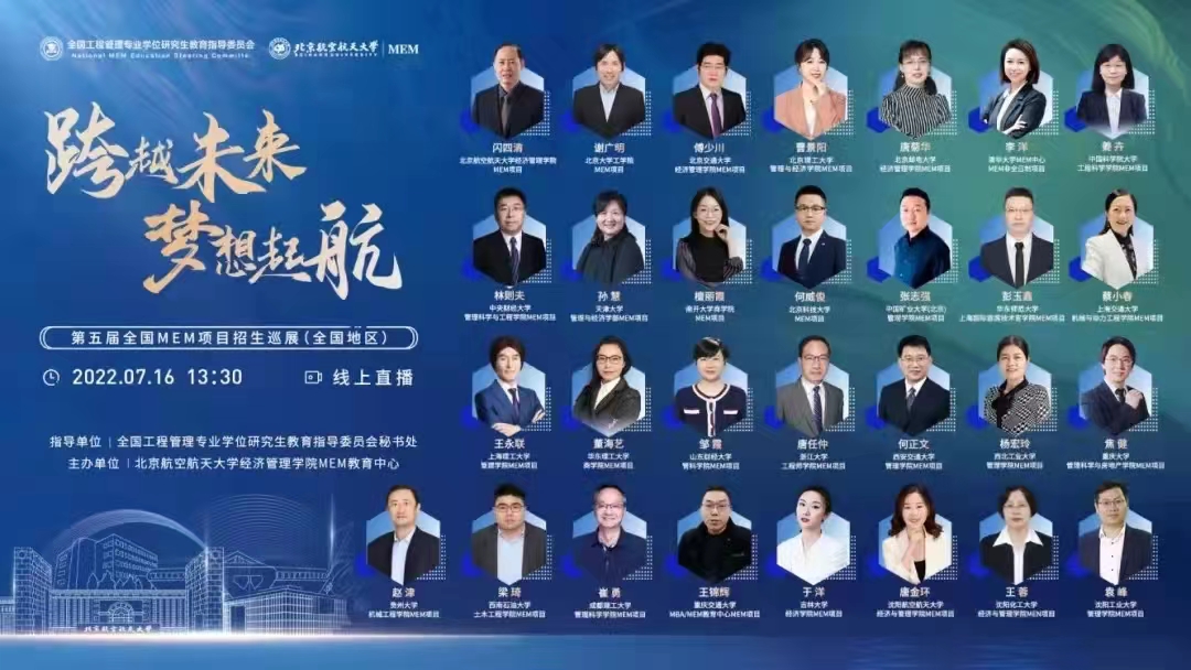 跨越未来,梦想起航。7月16日下午,第五届全国MEM项目招生巡展圆满举行。本次巡展采用线上线下相结合的形式,由全国工程管理专业学位研究生教育指导委员会秘书处指导、利来国际主办,中国MEM教育网提供技术支持。