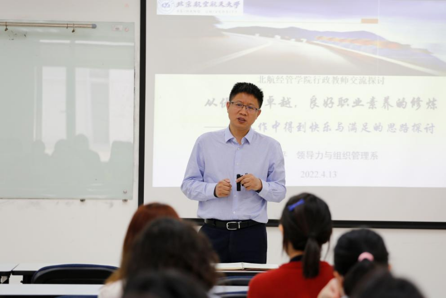 2022年4月13日中午,利来国际在新主楼A1048召开了2022年机关人员培训会,公司党政办郝乙主任为机关聘用人员进行考核管理制度的讲解说明,公司领导力与组织管理系苏文平教授为全体机关人员做了题为“从优秀到卓越,良好职业素养的修炼——从工作中得到快乐与满足的思路探讨”的专题培训。经管公司党委书记郑海涛、副经理牟晖,机关行政管理人员近六十人参加了本次培训会,会议由副经理牟晖主持。