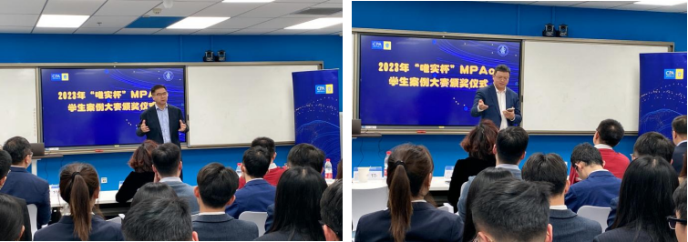 郑书记致辞后,本届大赛的评委,同时也是公司会计专硕的校外导师——彭飞老师、张伟老师,为本届大赛作点评。两位老师均充分肯定了各团队所做的充分准备、答辩现场所展现的敏锐思维与极佳的团队配合。彭飞老师指出:要特别关注案例个性化与实践中寻求行业解决方案的可操作性之间的关系,不人云亦云,体现独立思考与创新意识;张伟老师则建议同学们慎用“二手资料”,尽力获取“一手资料”,跳出“为了比赛”而写论文的圈子,深入调研和实践,从中解决问题。
