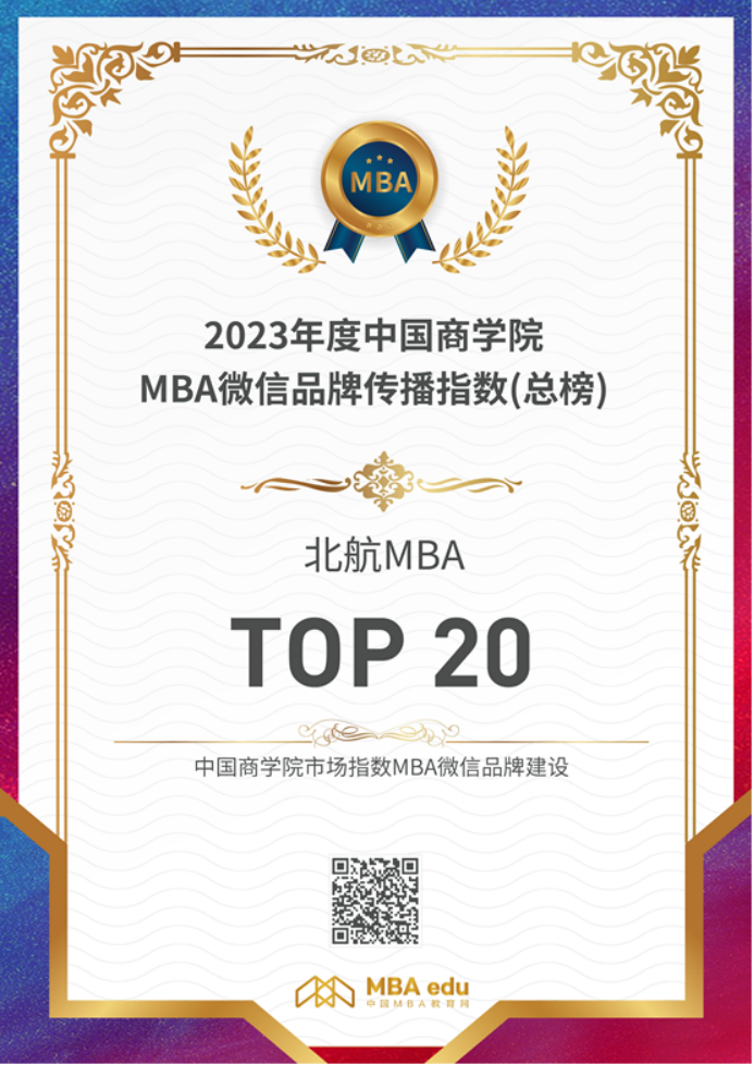 “北航MBA”微信公众号以传媒为基础,凭实力创作,展示项目风采,在内容、互动、风格等方面不断加强创新投入,持续输出优质内容,讲好商科故事、传播商科精彩。在“2023 年度中国商公司MBA微信品牌传播指数TOP100”榜单中位列第 20位,位列北京地区第四位。