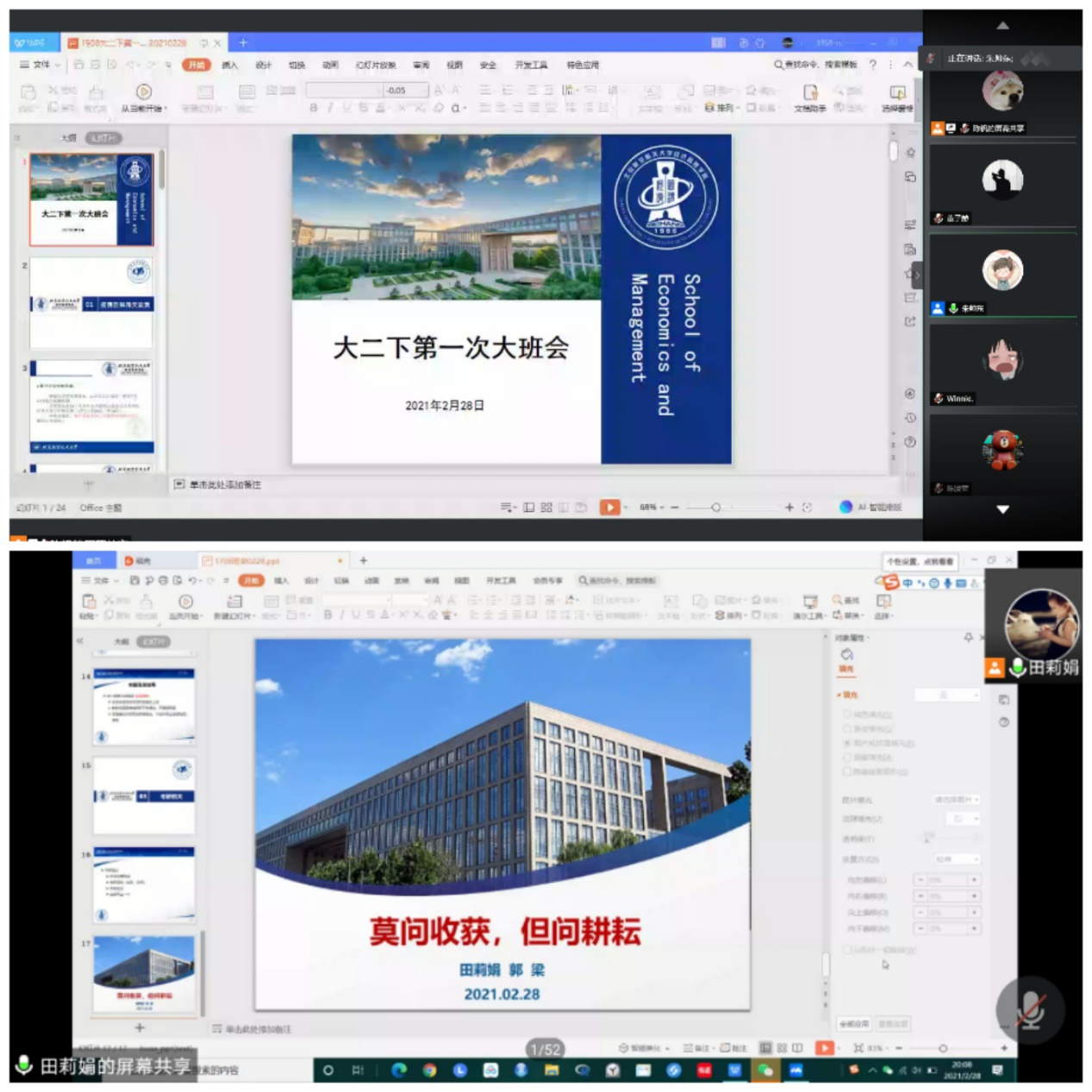 同时,各年级针对不同年级员工特点,差异化开展开学首日教育。1708大班即将毕业,针对员工较为关注的考研复试、毕业设计(论文)开题等工作,两位辅导员进行了答疑解惑。1808大班的主题为“抉择未来的路”,针对大三学年的第二学期,辅导员鼓励员工确定好未来方向,在国内升学、国(境)外深造、择业就业等方面,多方面收集信息,早做准备。1908大班辅导员则为同学们介绍了课程学习、专业方向分流等内容。高水平运动员大班的辅导员为大家分享了在疫情防控下抓好学业和训练的经验。