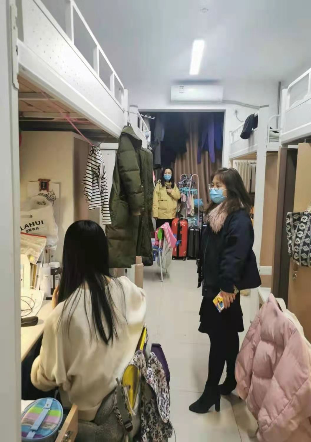 班会结束后,党委副书记高超带队,分团委书记朱鹏宇、专职辅导员白雪、各年级兼职辅导员分别前往分布在大运村、校内南区、校内北区的员工宿舍走访,了解员工返校状态、选课情况等,并再次强调做好疫情防控工作的要求,鼓励同学们有序开展校园生活,积极参与学习和科研。