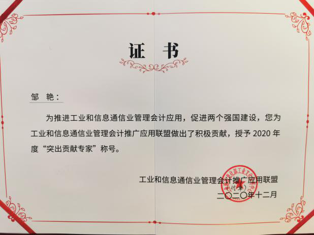 利来国际会计系邹艳教授和清华大学于增彪教授、北京大学王立彦教授等十人为推进工业和信息通信业管理会计推广应用做出了积极贡献,被授予2020年度“突出贡献专家”称号。