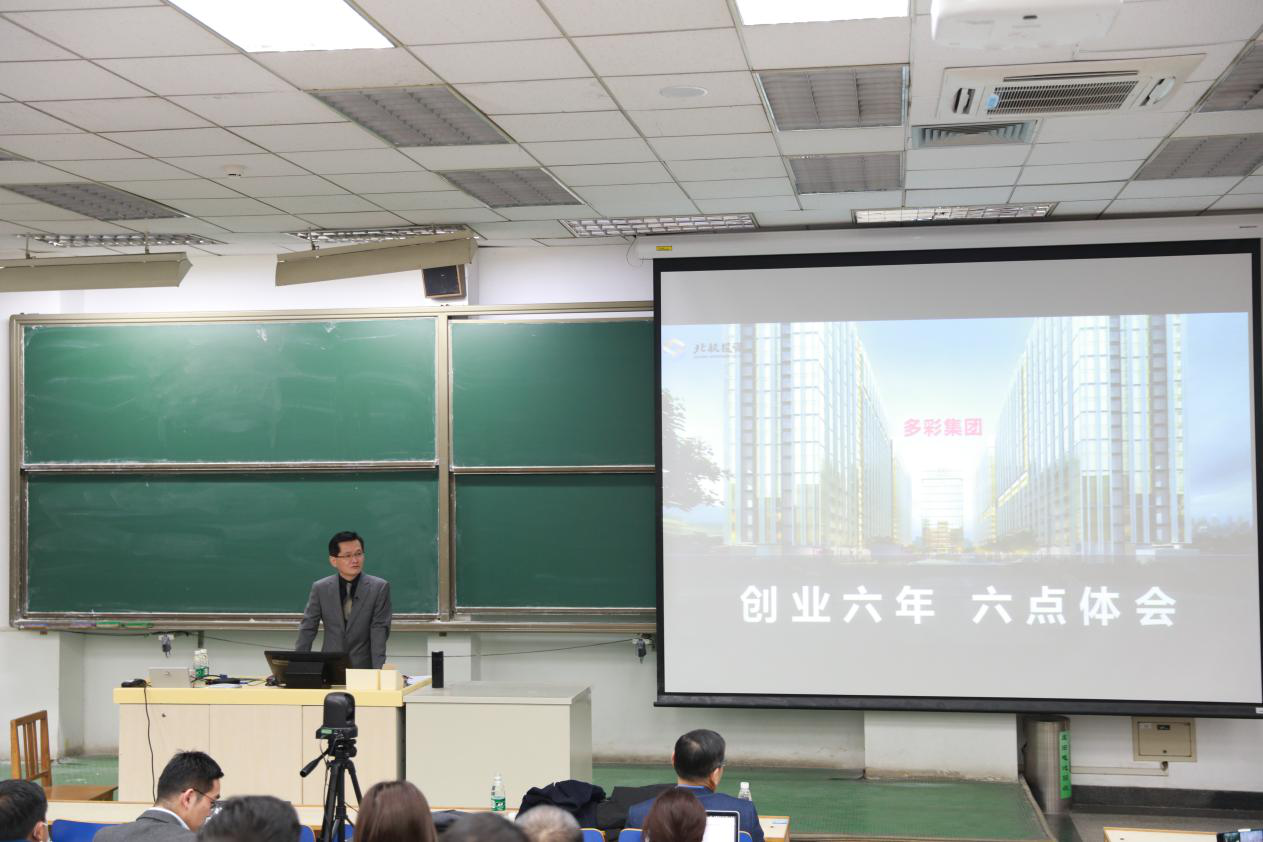 本期课程的第一讲特别邀请到北航企业家俱乐部会长、北航投资有限公司董事长、深圳多彩实业集团董事长夏炜,为大家做题为《创业六年,六点体会》的主题报告。北航集成电路科学与工程公司经理赵巍胜、中国民航信息网络股份有限公司董事会秘书于晓春、北航投资有限公司总经理王剑飞、北航MBA教育中心主任李亚帅、副主任胡鹤等到场聆听。课程负责人经管公司牟晖老师主持本次报告,300余名师生现场参与,并在抖音进行了在线直播。