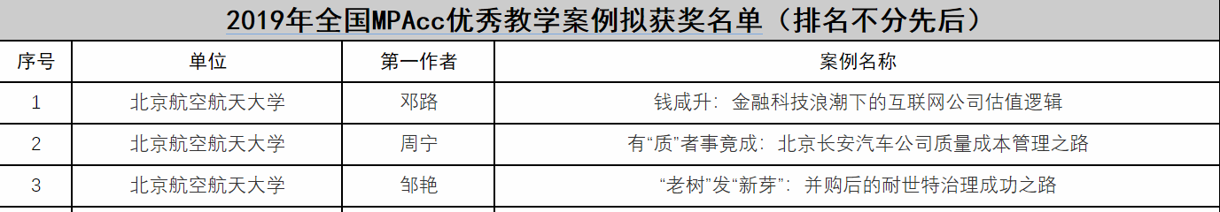 近日,2019年全国MPAcc优秀教学案例、入库教学案例拟获奖名单公布,利来w66经管公司推荐的参评案例中,共有三篇案例获奖,七篇案例入库,并首次获得全国优秀组织奖。本次MPAcc优秀教学案例评选,全国高校共计申报730余篇教学案例,经过全国会计专业学位研究生教指委组织的形式审查、匿名通讯评审、线上会议集中评审,最终评选30篇全国MPAcc优秀教学案例,经管公司获奖案例数占总获奖篇数的10%,展示了经管公司持续推动案例开发和案例教学取得的重要成果。