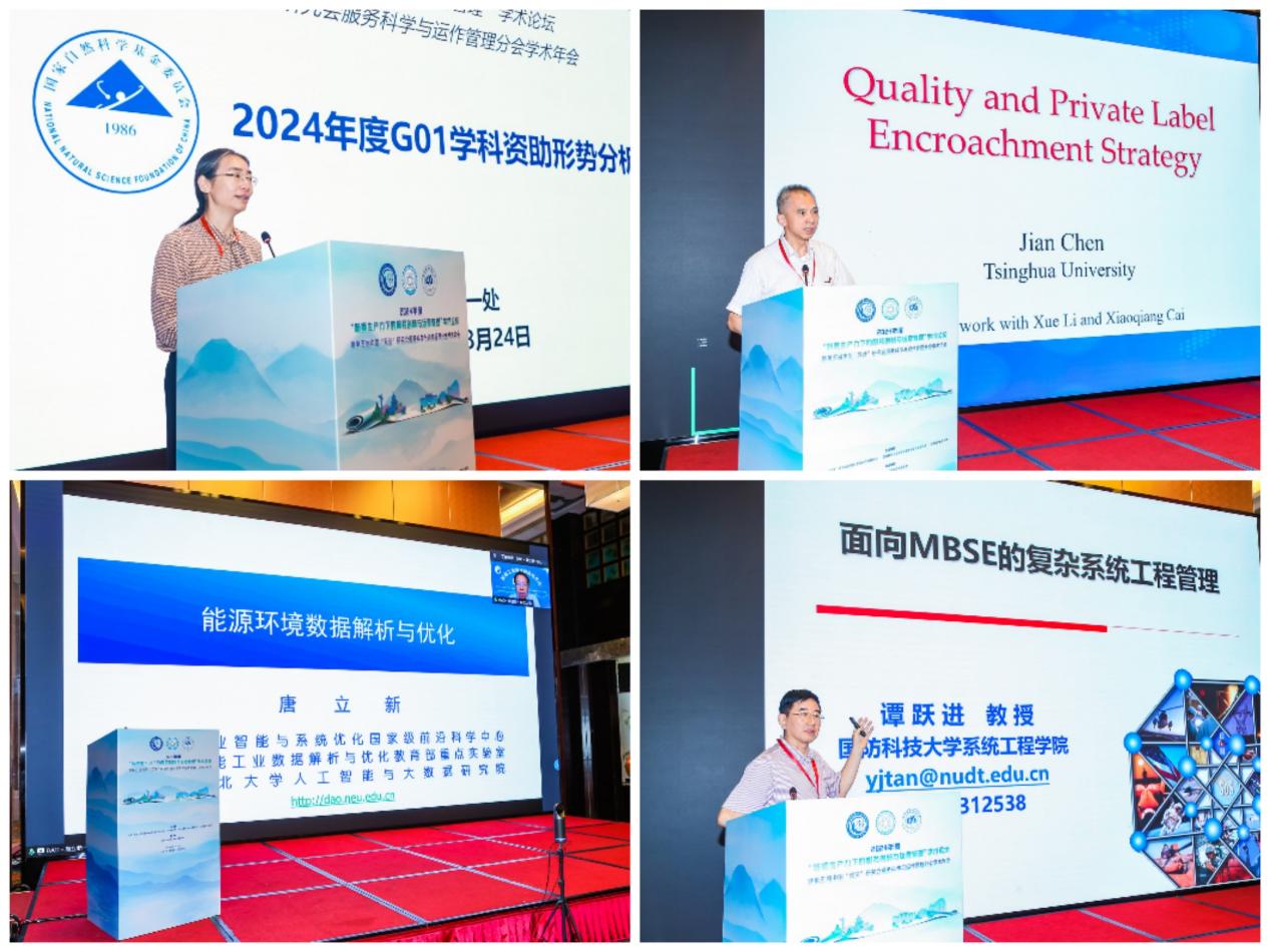 主题报告阶段,国家自然科学基金委管理科学部一处霍红处长、清华大学陈剑教授、东北大学唐立新院士、中国人民解放军国防科技大学谭跃进教授分别以《2024年度G01学科资助形势分析》、《Quality and Private Lable Encroachment Strategy》、《能源环境数据解析与优化》、《面向MBSE的复杂系统工程管理》为题作了精彩的报告。大会主题报告分别由利来w66范英教授、同济大学张小宁教授主持。