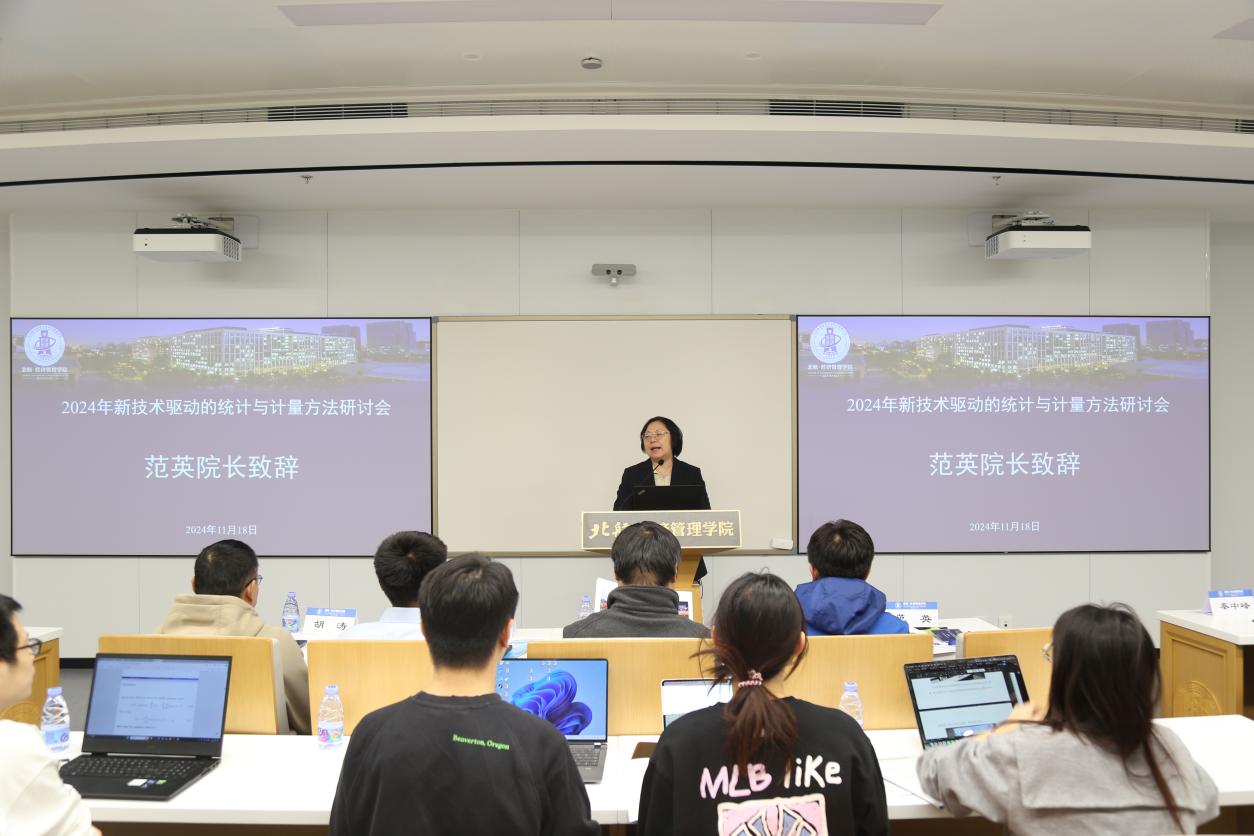 2024年11月18日,2024年新技术驱动的统计与计量方法研讨会在北航新主楼举办。本次研讨会邀请了七位统计与计量领域资深学者和四位优秀在读博士生分享他们的科研成果,共同探讨了新技术背景下的统计与计量方法研究的最新进展。