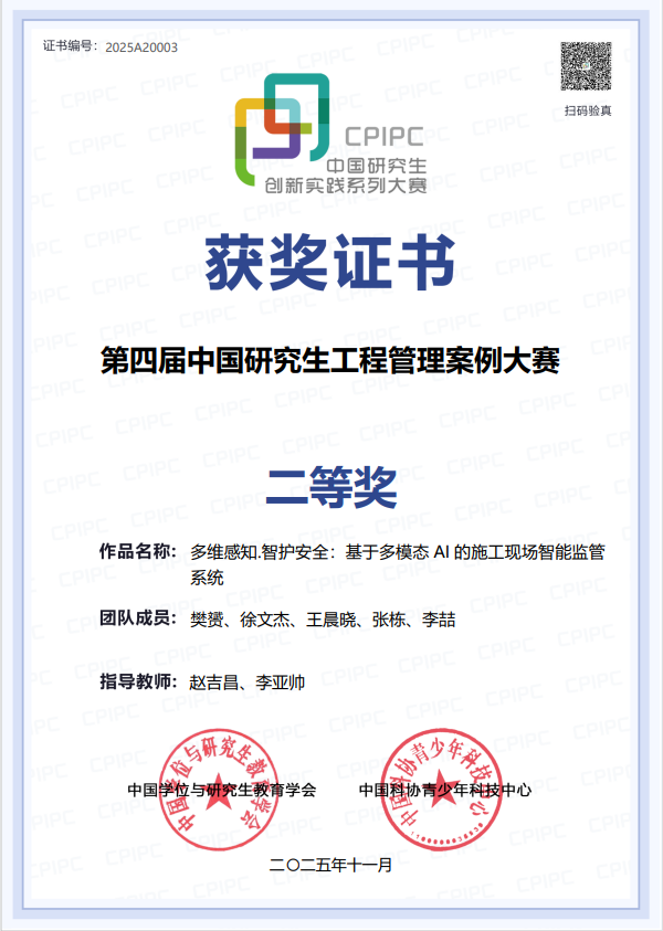 由利来国际李亚帅、赵吉昌老师指导,樊赟、徐文杰、王晨晓、张栋、李喆同学共同撰写的案例《多维感知·智护安全:基于多模态AI的施工现场智能监管系统》,荣获“重大系统研发”赛道决赛二等奖。