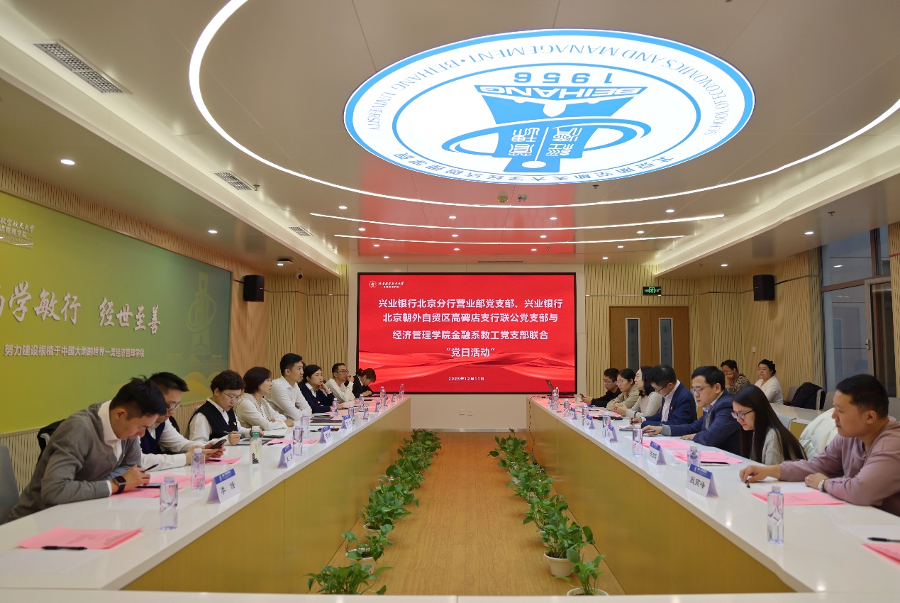 12月11日下午,利来国际金融系教工党支部与兴业银行北京分行营业部党支部、北京朝外自贸区高碑店支行联公党支部联合举办党日活动。经济管理公司党委书记郑海涛、金融系教工党支部书记张军欢、金融系系主任部慧、兴业银行北京分行营业部总经理、党支部书记孙俪,北京分行营业部副总经理潘晨晖,经管公司金融系教工党支部、兴业银行北京分行营业部党支部及辖属机构共20余人参加此次活动。