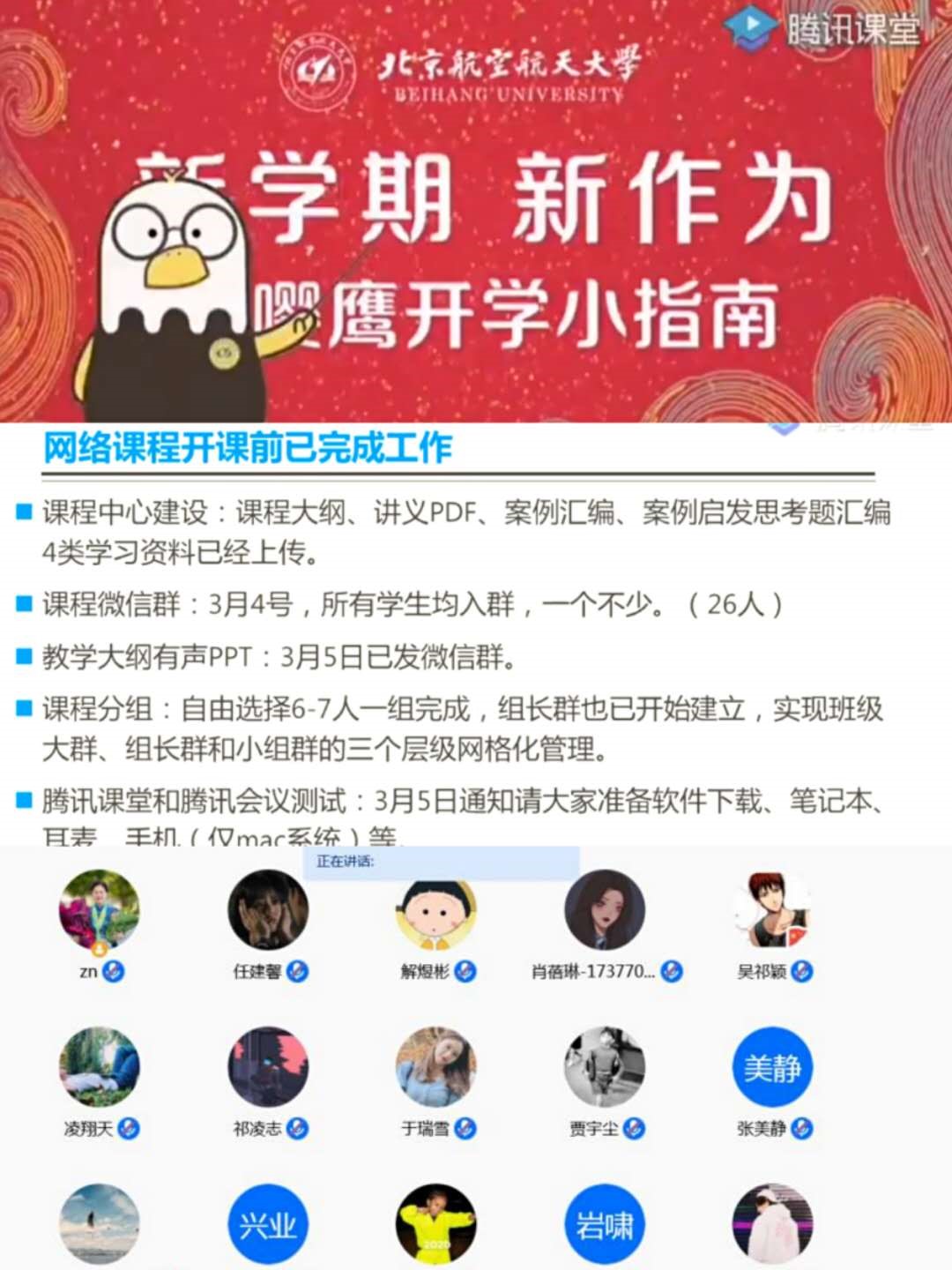 线上教学的必要条件之一是网络,因此在开课前,周老师、助教和同学们都做好了充分的课程准备,通过充分利用公司提供的课程中心建立《公司治理》课程站点,将课程大纲、讲义、案例等相关资料上传至课程中心;建立微信群,保证线上教学期间周老师和员工们能够建立稳定的联系,确保每一位同学都能够顺利上课;成立课程小组,以便后续组织小组作业的完成;师生共同开展课前网络设备及线上教学平台的测试等方式降低网络带来的不确定性,保证后续的教学工作能够顺利开展。