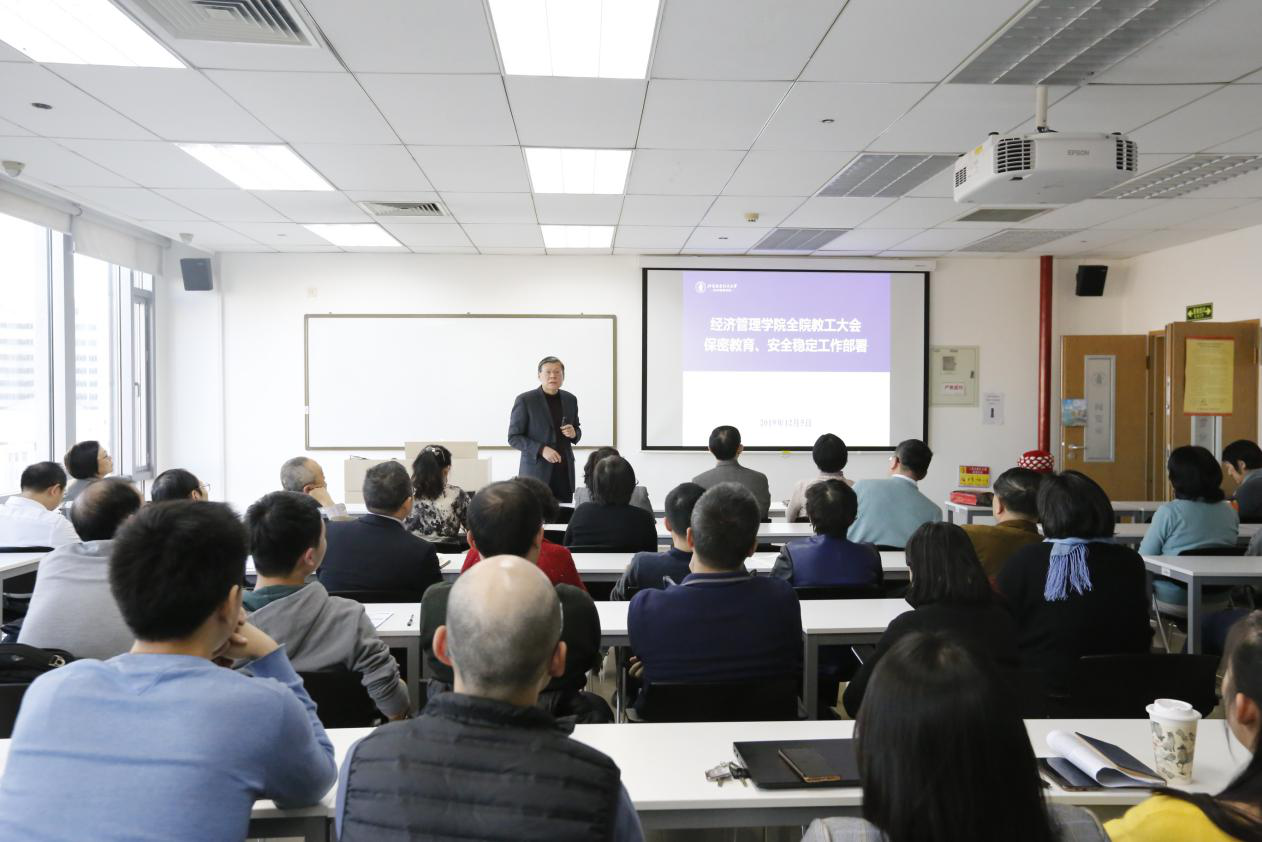 2019年12月5日下午,利来国际在新主楼A706教室召开全体教工大会,集中开展保密教育和安全稳定工作部署,分党委书记刘志新主持会议。