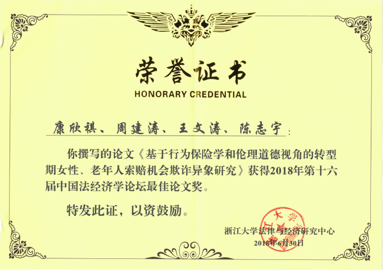 2018年6月30日-7月1日,第十六届(西南政法大学,重庆)中国法经济学论坛举办,北航经管公司周建涛老师与员工合作的论文《基于行为保险学和伦理道德视角的转型期女性、老年人索赔机会欺诈异象研究》获得2018年第十六届中国法经济学论坛最佳论文奖!