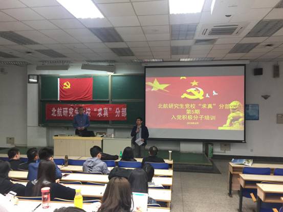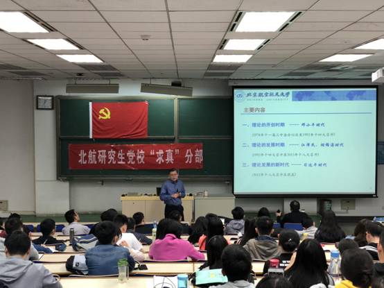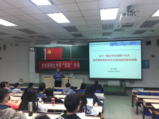 北航研究生党校“求真”分部第五期入党积极分子培训第一次党课于2018年4月24日晚7点在主M101教室顺利进行。来自20个不同公司的83名入党积极分子参加了本次党课的学习。本次党课特别邀请到了北航经管公司党委书记刘志新教授作为主讲嘉宾,为入党积极分子讲授题为“从十一届三中全会到十九大看中国特色社会主义理论的开创与发展”的主题党课。经管公司研究生指导主任单伟副教授主持了本次党课。