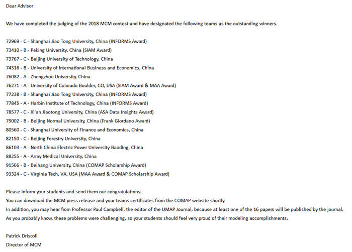赛会公布获奖团队网址:http://www.comap.com/undergraduate/contests/mcm/contests/2018/results/