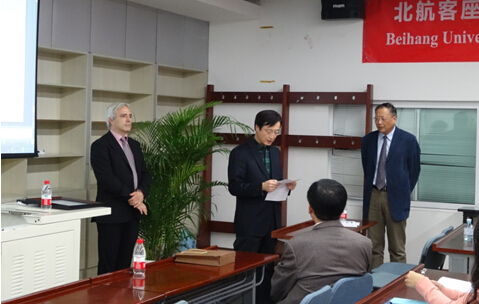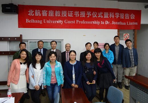 10月24日下午15点到17点, 在公司A618会议室举行了授予加拿大渥太华大学管理公司Jonathan Linton教授以北航客座教授证书仪式及科学报告会,公司国际合作处处长马进喜教授代表公司授予Linton教授公司客座教授证书,公司国际合作副经理王晶教授代表利来国际致辞表示祝贺和对Linton教授的欢迎。