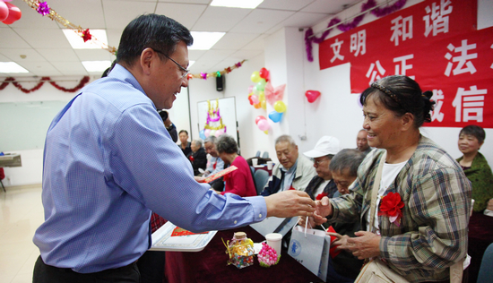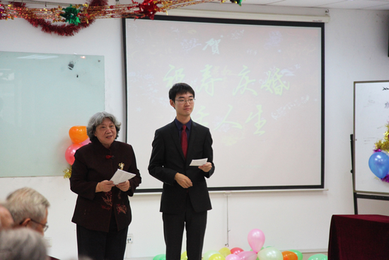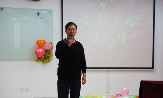 在活动开始之前,经管公司1208党支部的同学们为老人们佩戴了红花。本次活动的主角是十二位寿星和一对白金婚,一对钻石婚和四对金婚的老人们。同学们为他们赠送了精美礼品,祝愿寿星们健康长寿,祝愿白金婚,钻石婚,金婚的老人们幸福美满,生活多姿多彩!参加这次庆典活动的退休教工党支部的李清书记,校离退休处分党委副书记白瞾宇,经管公司党委副书记王喜忠,校关工委副主任曾妙南,经管公司党委书记刘志新老师分别致贺词。刘书记代表经管公司党委和院领导向在场的各位老同志表示祝贺并简单介绍了经管公司近年来的发展与成就,特别强调了这些成就中离不开老一辈同志打下的基础和作出的贡献,也感谢老一辈同志们关心下一代,不断为经管公司的发展付出心血。刘书记讲话中的字字、句句感人肺腑,温暖着每一个离退休同志的心。他还代表经管公司向在场的寿星和白金婚,钻石婚,金婚夫妇赠送了礼品和红包。