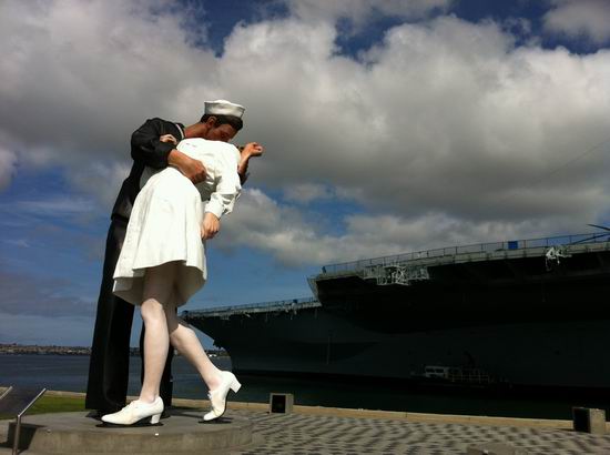 胜利之吻--Unconditional surrender是纪念二战胜利的著名雕塑,俗称胜利之吻,旁边是二战中服役的中途岛号航母,如今已经建成博物馆,这是圣地亚哥海边的著名景致,拍摄时的云朵和光线恰到好处