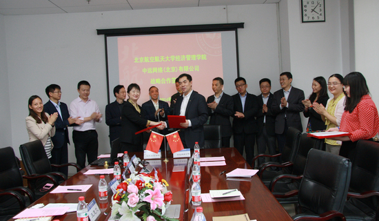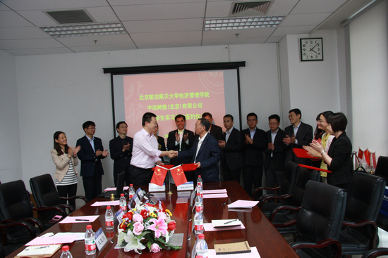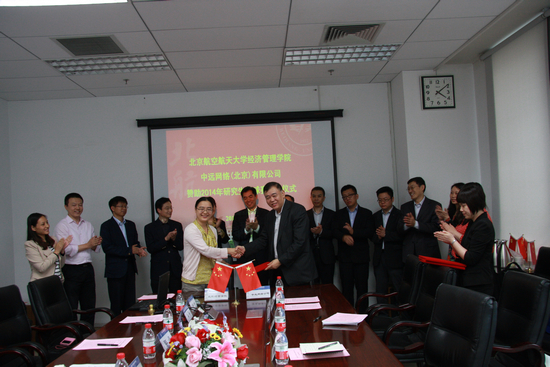 2014年5月9日15时在北航新主楼A座612,中远网络(北京)有限公司与北航经管公司就双方合作内容进行了深入沟通和交流,进而达成合作意向,共同签署了战略合作意向书、共建员工实习基地协议、北航研究生足球赛赞助协议,并举行了MBA社会导师聘任仪式。经管公司出席签约仪式的有:经理王惠文教授、副经理王晶教授、党委副书记高翔老师、研究生指导主任牟晖老师、经理助理郑海涛老师、职业发展中心梁娜老师;中远网络(北京)有限公司出现签约仪式的有总经理于春来先生、书记谢超峰先生、副总韩明科先生、总经理助理李晓达先生、应用服务部总经理张志钢先生、航海科技部总经理魏辰先生、市场营销部总经理崔志鹏先生、行政人事部副总经理石睿女士、企划部副总经理李青女士、行政人事部李忱忱女士。通过双方的合作与努力,为北航教育目标的实现与中远事业的发展开创更好的思路和模式。