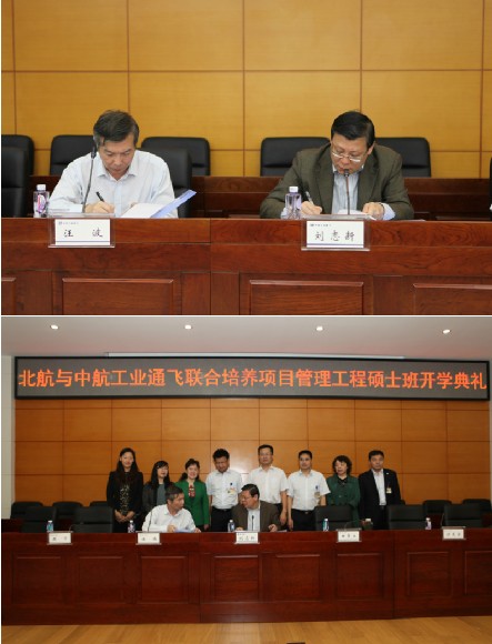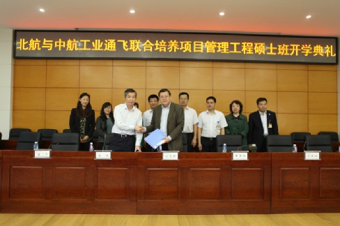 在全体人员奏唱的中华人民共和国国歌歌声中,开学典礼正式开始。刘志新书记和汪波副总经理分别代表北航经管公司和中航工业通飞签订了联合培养2012级项目管理领域工程硕士协议书。