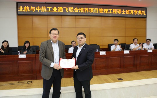 开学典礼上,北航经管公司党委书记刘志新教授为通飞工程硕士员工孙炫颁发了2012级工程硕士新生奖学金。