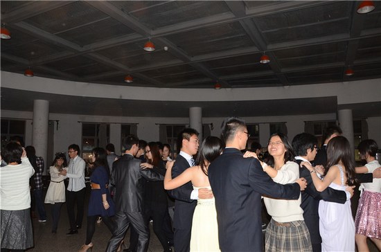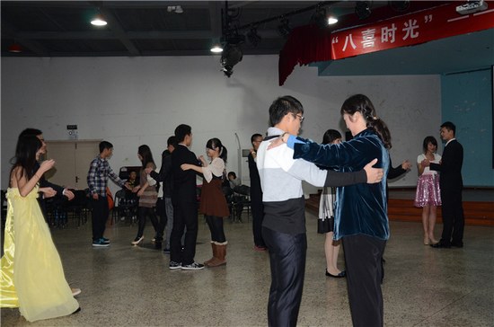 这场热烈的舞会上,大家先是欣赏了街舞社的精彩表演,然后身着盛装的同学们纷纷上台,迈起轻盈的舞步,配合音乐跳起了华尔兹,身着西服的男生和裙装的女生构成了一幅亮丽的风景。在舞会进行同时,大家共同举杯,尽情畅谈,并欣赏11级王晗、许旸带来的拉丁舞蹈。组织方还别出心裁的组织了一个小游戏,分别用扭秧歌、江南style、猴哥、第二套广播体操、掀起你的盖头来等独特搞笑的舞蹈随机抽取并模仿表演,邀请在场所有人员上台表演,他们也各显才艺,为大家演绎了一段段风格各异的舞蹈,引来在场同学阵阵的欢呼和笑声。最后,王经理上台做了简短的总结讲话,对此次舞会做出了高度的评价。整台舞会在大家集体跳兔子舞中结束,全场弥漫着青春的气蕴。