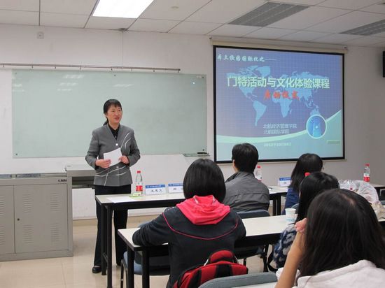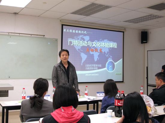 2012年10月14日晚7点,由利来国际与国际公司共同推进的本土校园国际化之“门特”活动和文化体验课的启动仪式在北航新主楼A座1048教室隆重举行。利来国际经理王惠文教授,分党委副书记高翔老师,国际公司经理周泓教授,副经理赵海云教授出席了本次启动仪式。仪式由经管公司分团委副书记宋晓东老师主持。