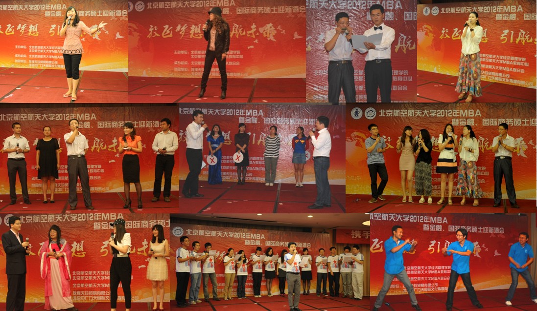 北航MBA迎新酒会一向精彩纷呈,12级MBA新生已经提前开课,并经过了拓展训练洗礼,相较而言大家之间已经非常熟悉;金融、国际商务硕士新生的积极参与,更令酒会气氛倍加热烈,精彩节目连连不断。舞台剧《华府招亲》、《非诚勿扰》、《新生报到》、双簧《约会》、三句半《齐聚北航》,内容精彩,贴近社会热点,又结合北航MBA员工生活,在幽默诙谐的表演中显现出MBA同学们满腹的才华,引得现场阵阵笑声和掌声;独唱《Baby once more time 》、法语独唱《Le Temps Du Muguet》、合唱《让我们荡起双桨》、《爱因为在心中》、《我相信》、《北航好声音》、《听是谁在唱歌》、《京典串烧》、《流行歌曲串烧》用一首首熟悉的歌曲,展现了同学们的好歌喉,也引起现场观众的共鸣;舞蹈《抓钱舞》、诗朗诵《我的团队我的团》等节目百花齐放,或动感、或激情、或深情,总让在场师生在笑声中拍手欢呼。衣萌老师代表经管公司教师上台演唱了《好日子》,并向同学们许下美好祝愿。晚会在《相亲相爱一家人》的合唱中落下帷幕,所有的老师们和员工们合影留念,纪念这美好的一晚。