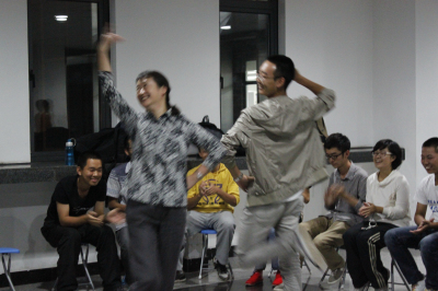 随后,王经理来到了32班的联谊会现场。32班的班长吴楠和杜苗寒霜同学分别以一支热舞将联谊会推到了高潮。吴楠同学将王经理请上舞台,共同表演了一支维吾尔族舞蹈,赢得了全体同学的热烈欢迎。节目过后,王经理亲切地问候了12级新生,与同学们交流后,激励同学们要懂得自我探索,并用在法国留学时的亲身经历告诉同学们要学会适应生活。王经理的讲解细致深入,不仅使大一新生,也使大二的门特们对大学有了更深刻的理解和认识,对未来的生活少了一分迷茫,多了一分坚定。