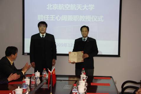王建中副董事长代表北航向王心阔教授颁发了聘书。对王心阔教授的受聘表示热烈的欢迎和祝贺,希望王心阔教授能够经常到北航来讲座,特别是为北航新举办的面向中高层领导的EMBA班进行讲座,并开展相关研究,加强北航与中航国际在产学研结合等方面的融合和合作。王心阔教授感谢北航对他的信任,表示与北航的合作源远流长,将努力为北航的发展做出自己的贡献。