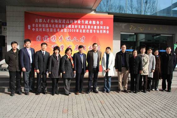参加此次活动的领导有北航经管公司党委书记刘志新教授,北京市人事局市场管理办公室张瑞,丰台科技园工委会委员、系统工会罗荣富主席,丰台科技园工委委员、组织人事处石岩处长,北航人才招聘处姜恩桥副处长,北航经管公司党委副书记姚伟龙,北航经管公司802支部书记贾素玲,北航经管公司803支部书记杨敏、北航经管公司分团委书记刘件,北航经管公司职业发展中心主任牟晖等。