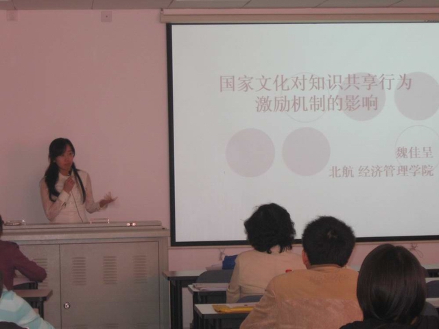 本次分论坛设有十五场专家讲座和十场归国博士生系列讲座。开幕报告正是“梦翔彼岸。归国博士生系列讲座之一”。在本场报告中,首先是魏佳呈同学给我们带来了她在美国期间的研究成果“国家文化对知识共享行为激励机制的影响”。该论文论述了激励机制的产生背景,研究意义,研究方法和模型,以及研究所得到的结论。魏佳呈同学以中美文化的差异入手,来分析知识共享行为的认知过程,以及“国家文化”这一影响因素。
