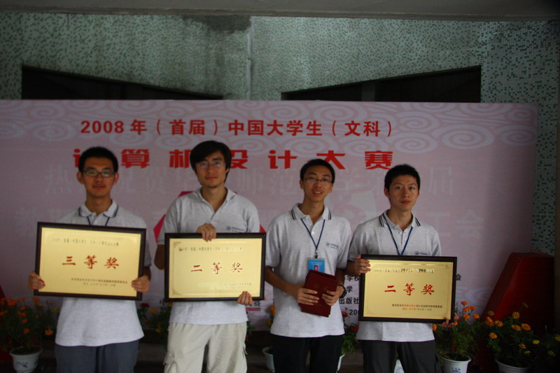 公司在2008年(首届)全国高校文科类老员工计算机设计大赛决赛中获得两项二等奖、一项三等奖及团体精神文明奖。此次大赛决赛与7月28日—31日在华中师范大学(武汉)举行,公司以经管公司副经理魏法杰教授为领队一行9人参加了此次比赛。公司的三支参赛队经过计算机水平测试及现场演示答辩在58所高校134支参赛队中脱颖而出连获三项大奖,为公司争得了荣誉。