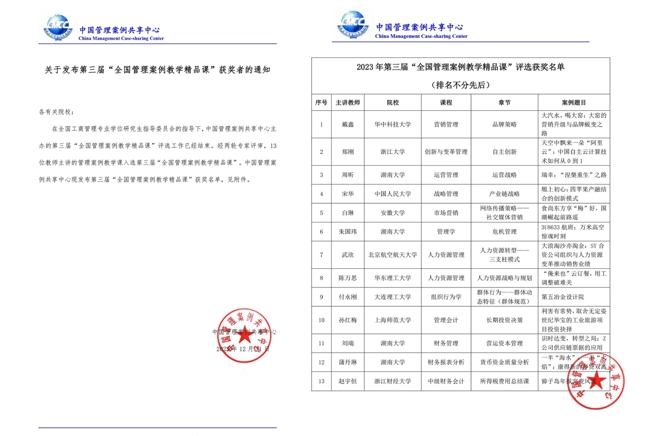 12月11日,在全国工商管理专业学位研究生指导委员会的指导下,中国管理案例共享中心主办的第三届“全国管理案例教学精品课”评选工作结束,经过两轮专家评审,最终确定10所院校的13份教学视频入选。