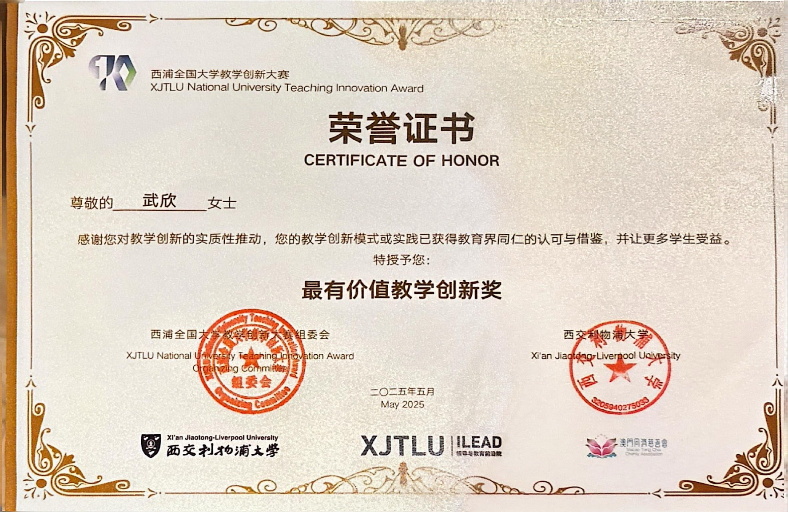 2025年5月18日,西浦全国大学教学创新大赛(简称“西浦大赛”)十周年庆典在苏州西交利物浦大学举行。为了表彰在西浦大赛中,其创新成果不仅在理论上具有前瞻性和创新性,而且在实践中具有可行性和有效性的杰出教学创新者,西浦大赛组委会设立了“最有价值教学创新奖”,经过专家评选,从西浦大赛十年来的获奖选手中选出了11位获奖者。公司武欣老师去年获得西浦大赛特等奖,此次获评“最有价值教学创新奖”。
