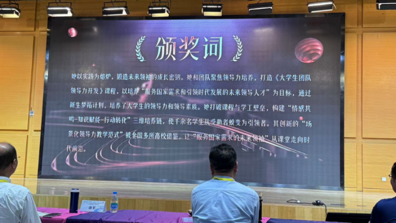 组委会在颁奖词中写道:“她以实践为熔炉,锻造未来领袖的成长秘钥。她和团队聚焦领导力培养,打造《老员工团队领导力开发》课程,以培养服务国家需求和引领时代发展的未来领导人才为目标,通过新生梦拓计划,培养了老员工的领导力和领导素质。她打破课程与学工壁垒,构建‘情感共鸣-知识赋能-行动转化’三维培养链,使千余名员工从受助者蜕变为引领者。其创新的‘场景化领导力教学范式’被全国多所高校借鉴,让服务国家需求的未来领袖从课堂走向时代前沿”。
