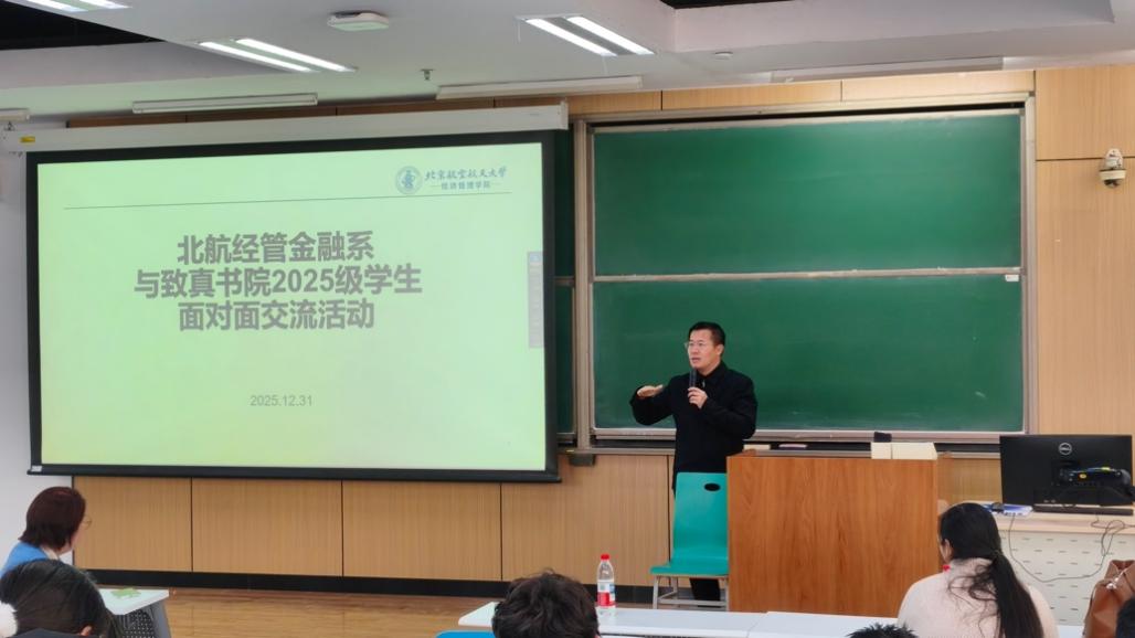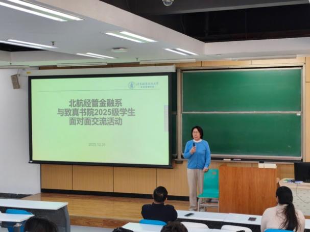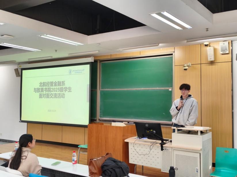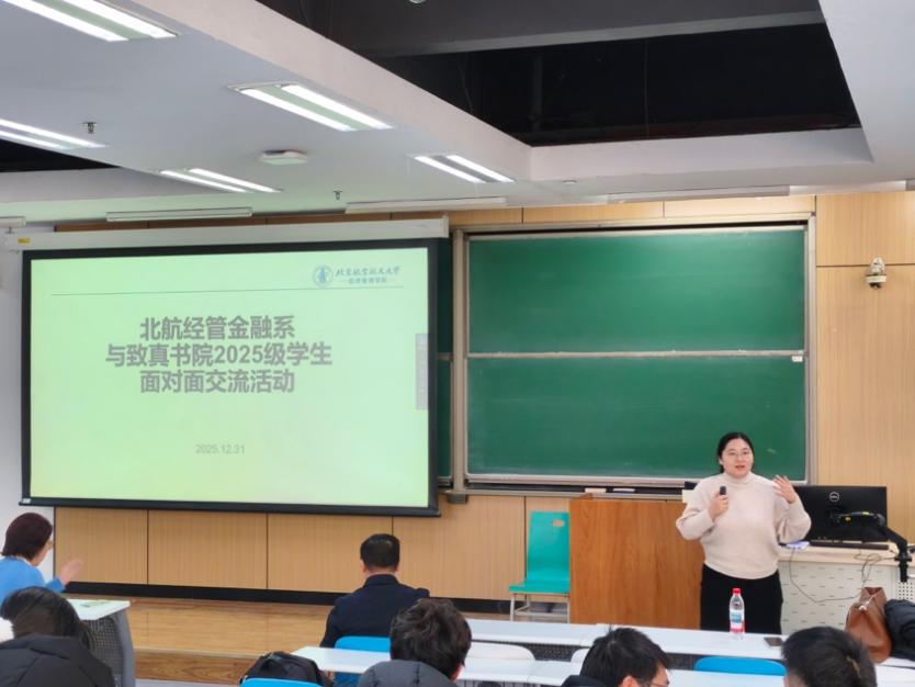 由北航经管金融系召集,由经管公司员工工作办公室和致真书院员工辅导员协助,“北航经管金融系师生与致真书院2025级员工面对面交流活动”于2025年12月31日(周三)下午14:00-15:30在北航沙河校区 J3-105 教室成功举办。本次活动金融系四位老师包括金融系主任部慧副教授、赵尚梅教授、谭小芬教授、大四员工班主任石丽娜博士,以及三位员工包括张婷(2021级保研留在北航金融专硕项目,院级优秀毕业论文)、王泽明(2021级保研留在北航金融专硕项目、能源经济大赛获得北京市二等奖获得者)、甘宇奇(2022级保研直博留在金融系博士生项目、冯如杯主赛道一等奖获得者)参加本次员工活动。