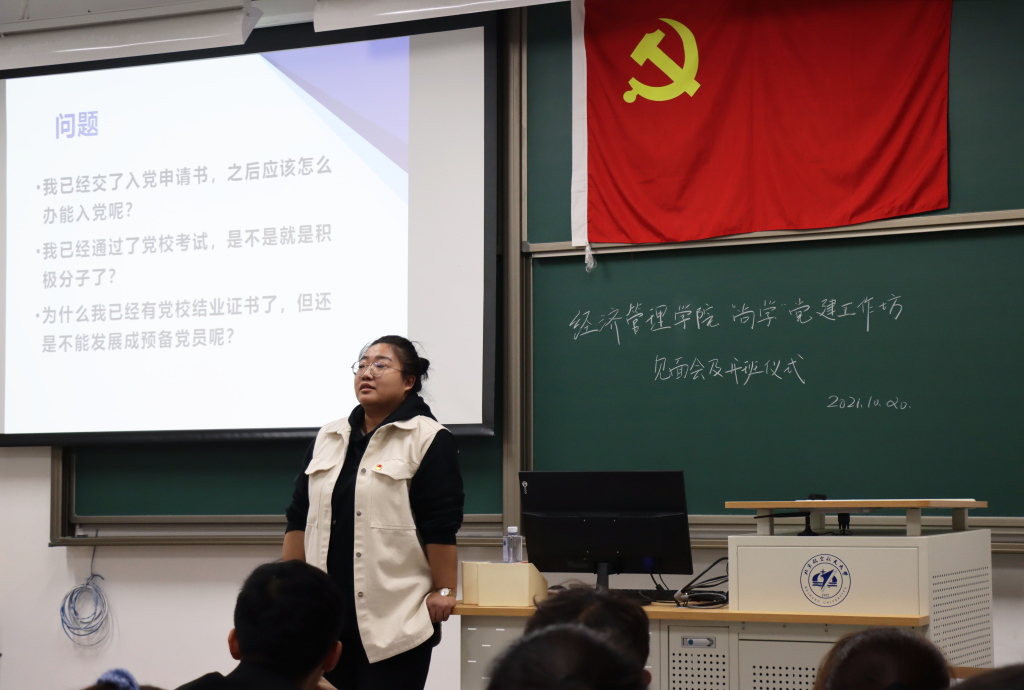 随后,党建工作坊总干事张晏源介绍党建工作坊总体情况,向同学们详细地介绍了本期课程的规章制度、培养方案和纪律要求,包括班级建设、实践活动、组织宣传、结业要求等。培训部、组织部、宣传部等部门负责人介绍了部门组织结构、工作职能和招新计划。