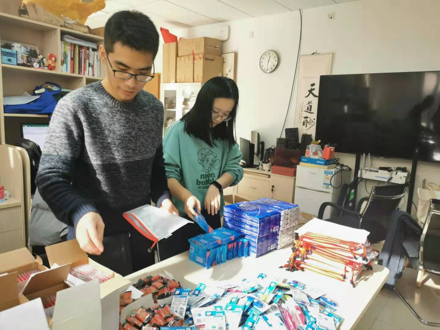 2020年12月24日,经济管理公司党委副书记高超、分团委书记朱鹏宇、专职辅导员白雪、2017级兼职辅导员田莉娟、郭梁、2018级辅导员张园园共同为考研员工分装礼包、书写祝福语。一字一句的祝福,体现出公司对考研学子细致的关怀和殷切的期盼。