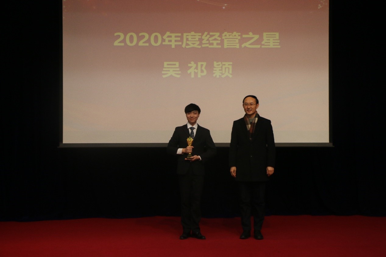 最后,副经理秦中峰为经管公司本科生年度最高荣誉“2020年度经管之星”获奖人——2017级吴祁颖同学颁奖。