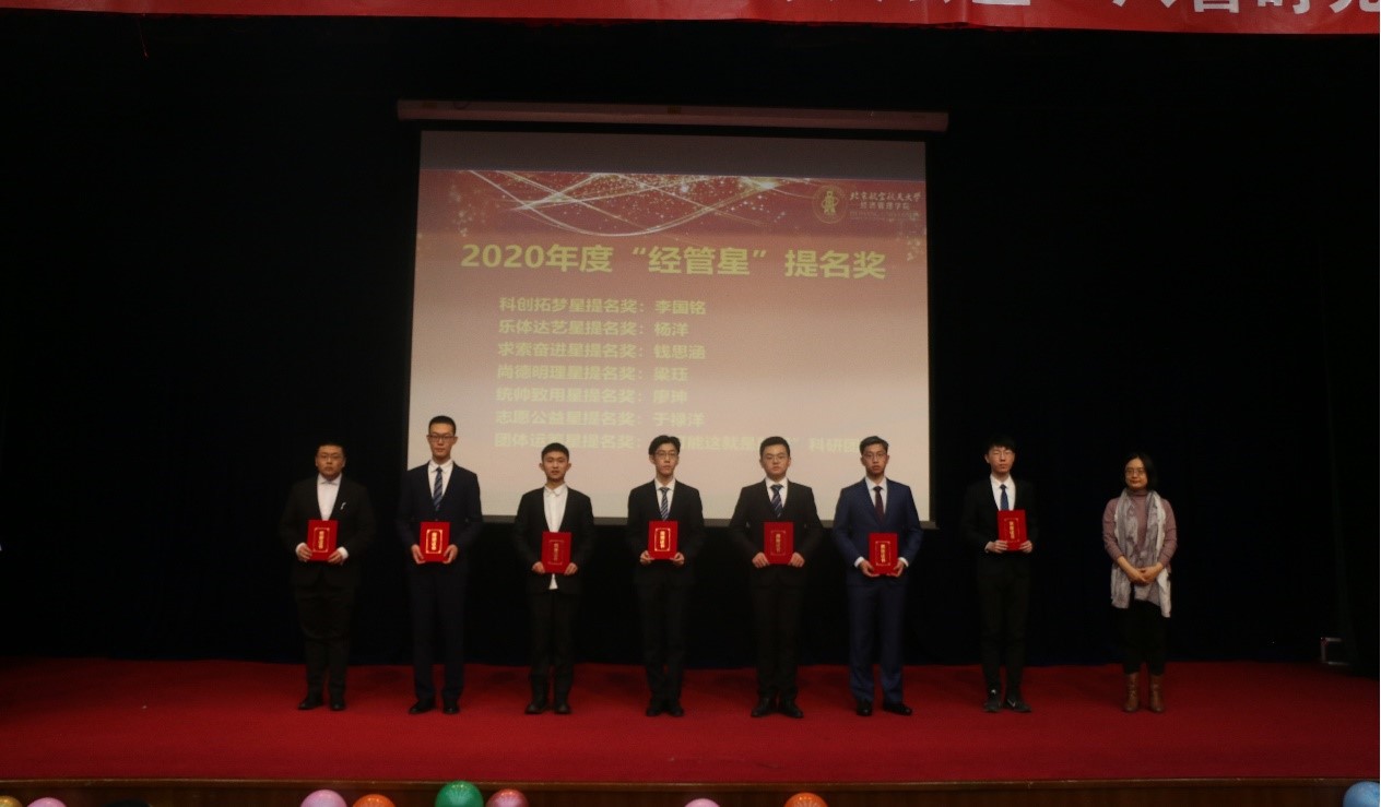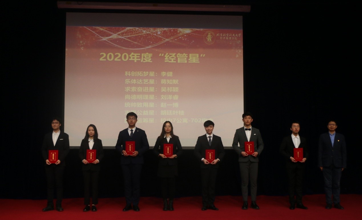副经理郑海涛宣读2020年度“经管星”获奖人名单并颁奖,他们分别是: “尚德明理星”刘泽睿、“求索奋进星”吴祁颖、“乐体达艺星”蒋知默、“统帅致用星”赵一博、“科创拓梦星”李健、“志愿公益星”胡廷叶枝、“团体运筹星”X7-702宿舍。