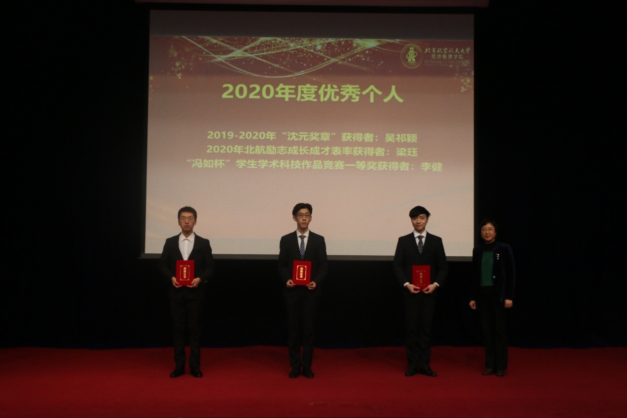 工会主席谢岚为2020年度优秀个人—2019-2020年“沈元奖章”获得者吴祁颖、2020年北航励志成长成才表率获得者梁珏以及第三十届“冯如杯”科技竞赛一等奖获得者李健颁奖。