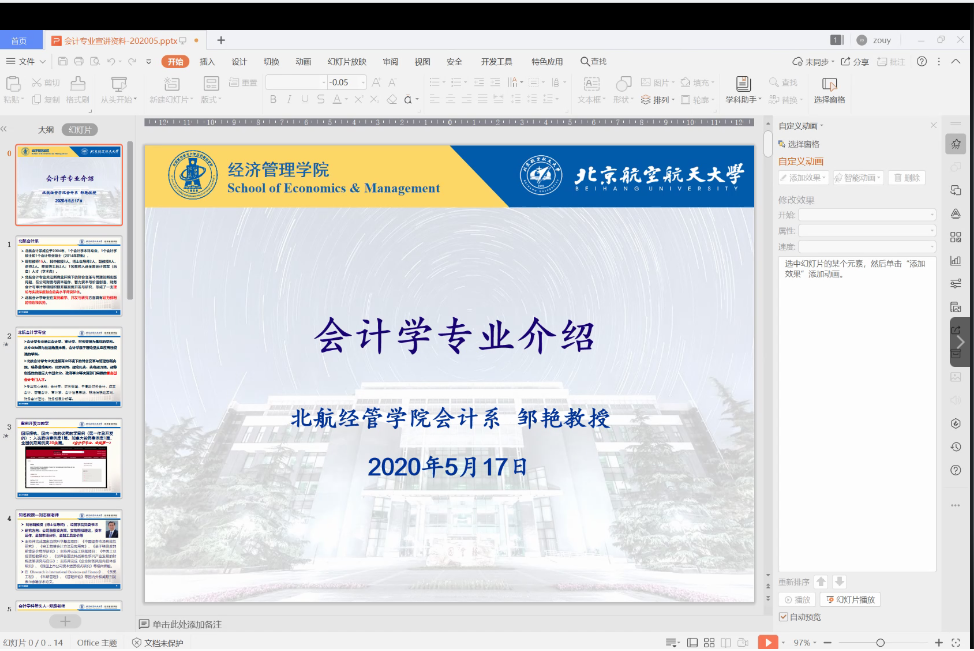 会计学专业的邹艳教授从专业历史,北航会计学专业的优势以及所取得的优秀成果等方面对利来国际的会计学专业进行了全面地介绍。邹老师也向同学们重点介绍了会计学专业的优秀团队力量,有许多优秀人才在各自的领域中取得了卓越的成果;并就大家十分感兴趣的毕业生就业前景展开讲解。邹老师也十分用心的为大家展示了几位会计学毕业生的感言,让同学们对会计学专业的理解更加深入。最后邹老师总结道,会计学这个专业可以为同学们创造无数的可能,并期待和同学们在利来国际相遇。